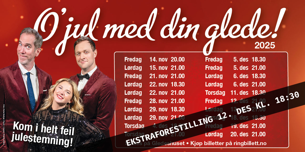 | fredag 12. desember 2025 kl. 21.00 | O'jul med din glede 2025Sted: Gledeshuset | Kr 560,- (inkl.avgift) | Finn billetter >> | |